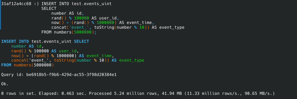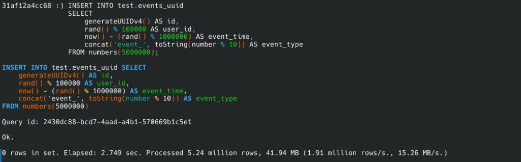 To test the real impact of UUID vs UInt64, we created two tables (events_uint and events_uuid) and inserted 5 million rows into each.